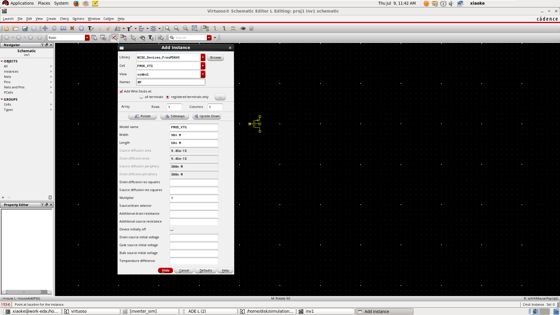 反相器由两个 mos 组成。接下来我们将画这两个 mos 。 Create - Instance, Library 选择 FreePDK 那个库, cell 选择一个mos, View 选择 Symbol, Name 随意取个名字。此时在光标处就会出现一个 mos 管的形状,点击就可以把它放在任何想要的位置。