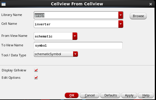 首先要给我们画的 inverter 创建一个 symbol。这里我们为方便进行自动生成。 Create - CellView - From CellView。 按如下默认设置即可,选择 OK 。