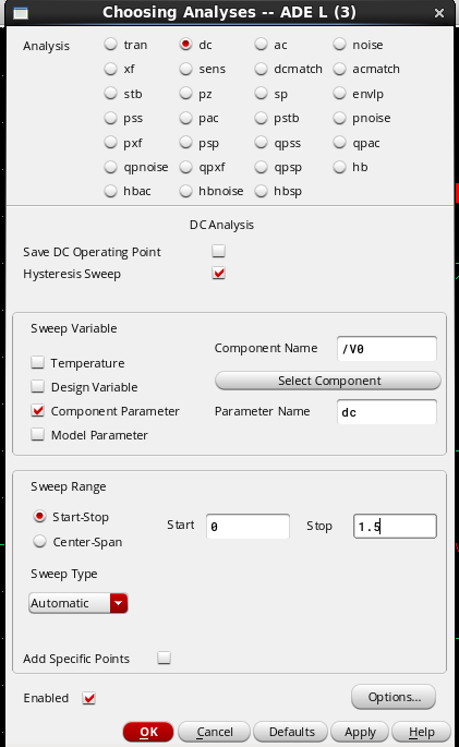 Analysis - choose, 这里就和 spice 一样了,选择一种 analysis 。