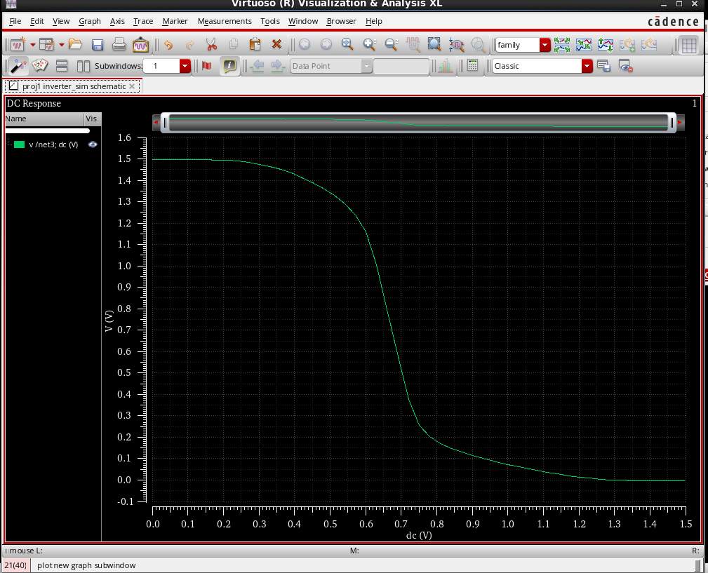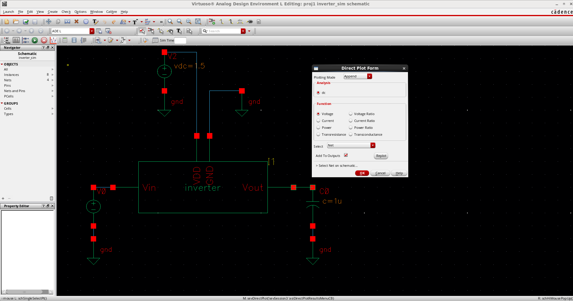Results - Direct Plot - Main Form,按如下图选择并在原理图中选择一个点来 plot。我这里选择 inverter 的 Vout,直接在原理图上选择对应位置即可。