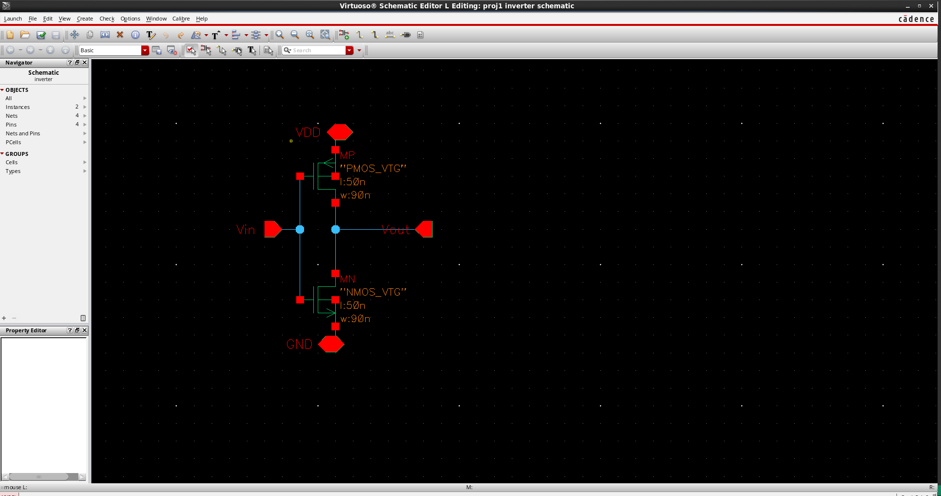 画好两个 mos 后,接下来增加四个 pin, 分别对应 Vin 、 Vout 、 VDD 、 GND。 Create - Pin ,根据需要选择输入-输出类型,之后添加即可。最后将两个 mos 和四个 pin 用线连接起来。