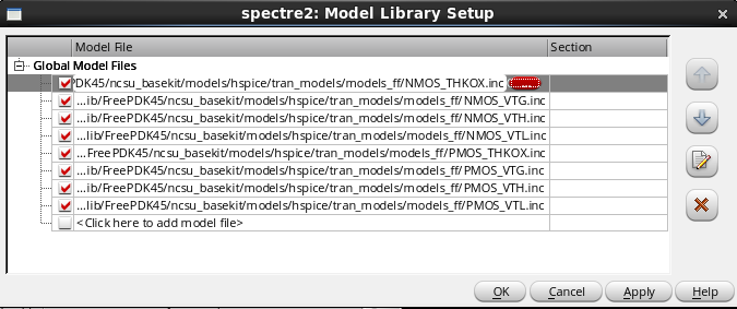 首先添加 model library。Setup - Model Library。 路径为 /path/to/pdk/FreePDK45/ncsu_basekit/models/hspice/tran_models , 把所有的 .inc 文件添加进去。