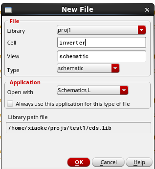 在安装好库后就可以画 cell 了。在画 cell 之前要新建一个库,用于存放我们画的 cell。步骤与上一节相同,只不过我们的路径选择一个空文件夹即可。在这里我新建的库的名字叫 proj1。