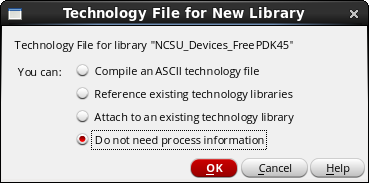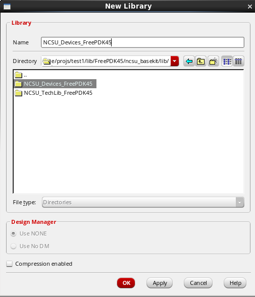 Tools - Library Manager - File - New Library, Directory选择 /path/to/pdk/FreePDK45/ncsu_basekit/lib/,Name 输入NCSU_Devices_FreePDK45,之后 OK。